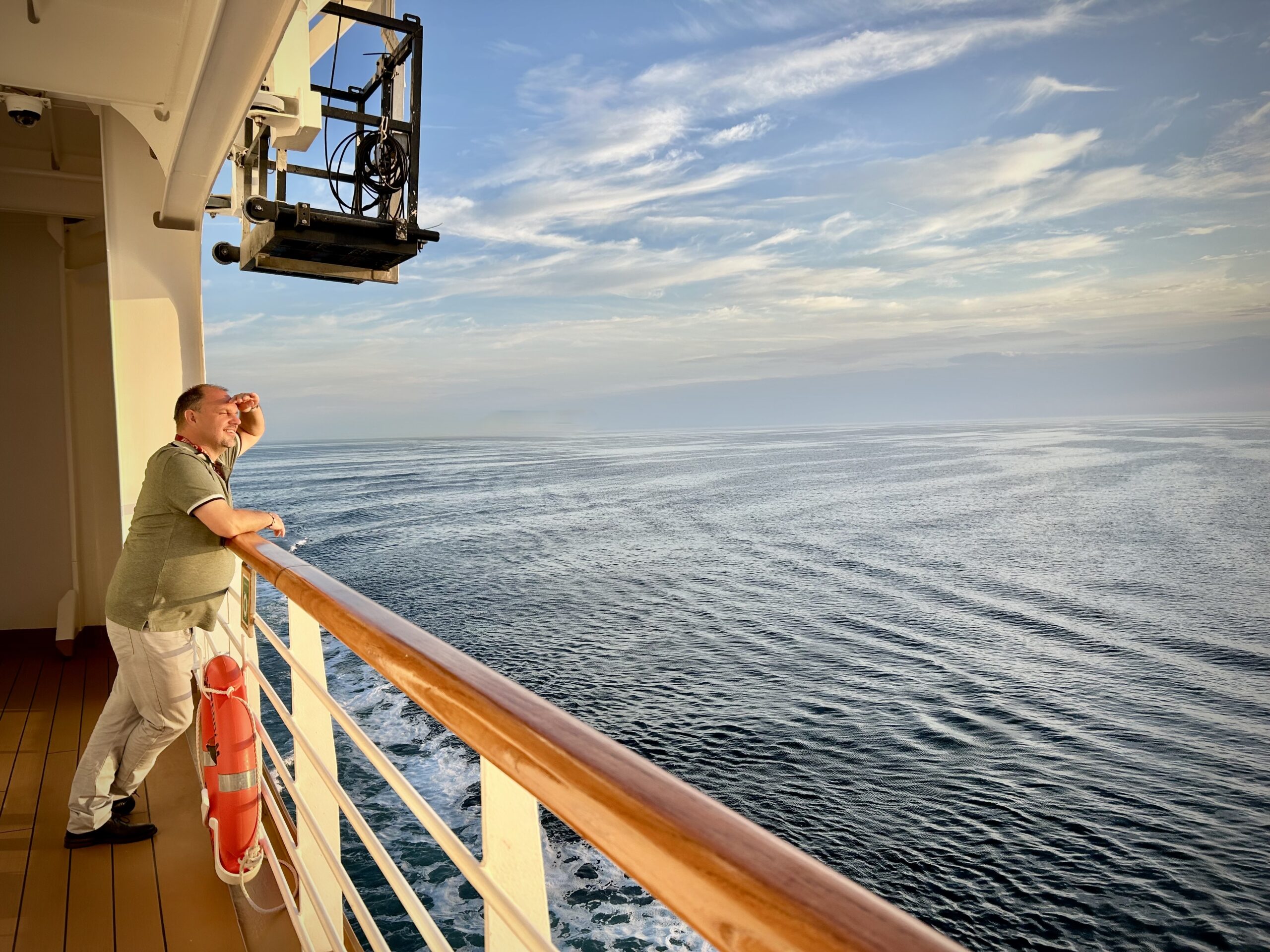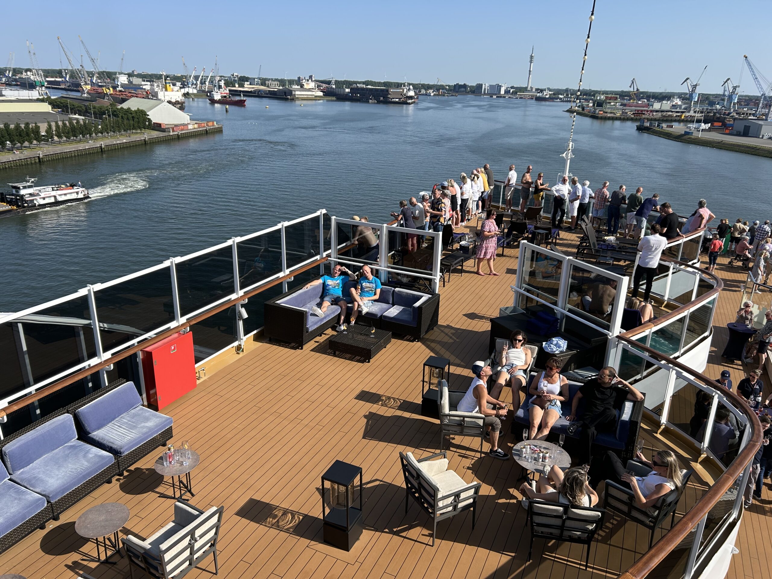 De sfeer aan boord was feestelijk: mensen zwaaiden, klonken glazen en op de achtergrond speelde de muziek. Dít is het begin van ons nieuwe avontuur en het voelt heerlijk!