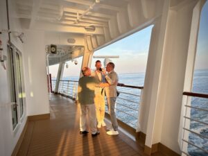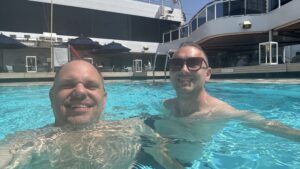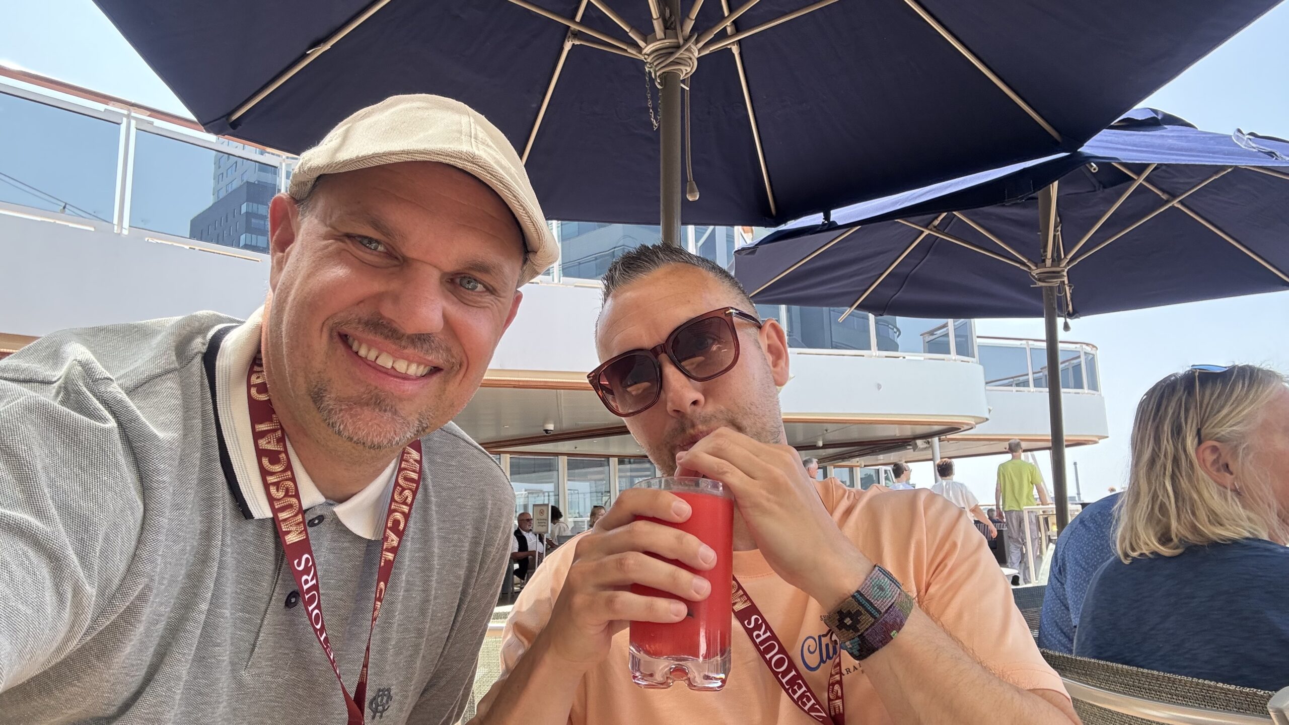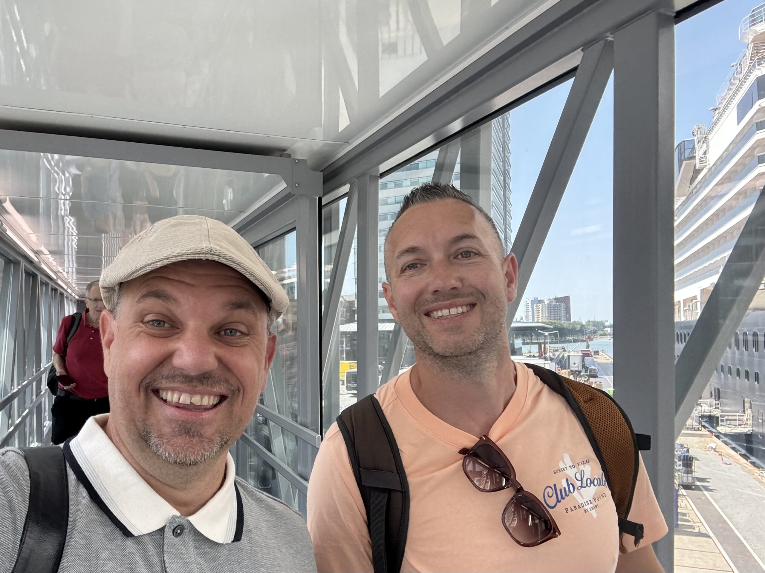 Opeens stonden daar ineens Erik en Robert bij de gangway! Vrienden van ons, en nét als wij dol op cruisen maar vooral op musicals en theater.