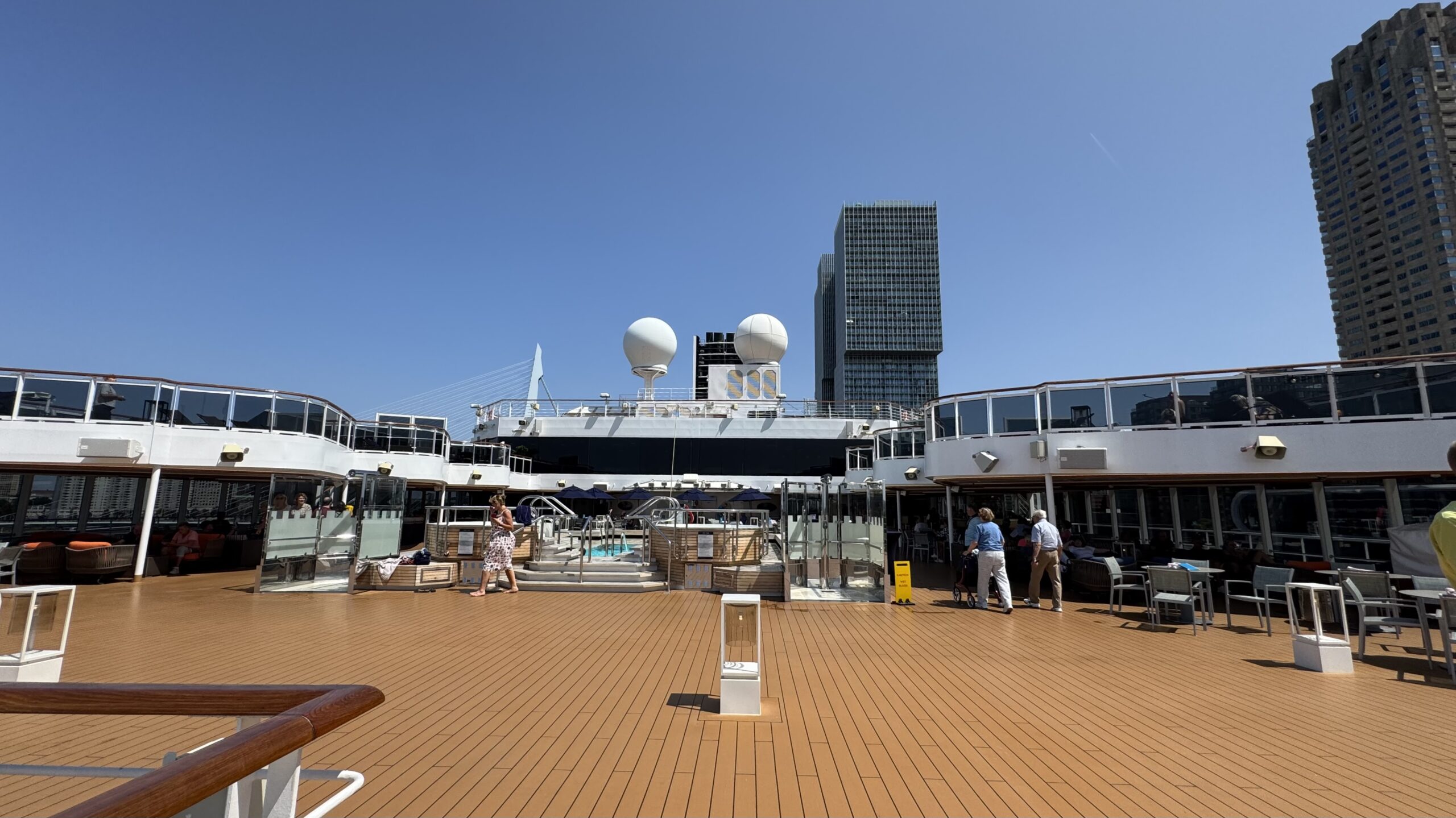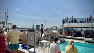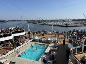 Op dek 9 het Lido Dek achter is het zwembad met de naam Sea View Pool waar de Sailawayparty plaatsvind. Maar eest een hapje van het Lido (het buffetrestaurant), een koud drankje en dan het water in.