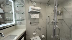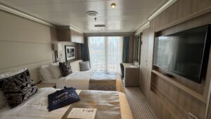 Zodra we aan boord waren, gingen we meteen op zoek naar onze hut om daar de kamerkaart op te halen. Een leuk detail: je kamerkaart krijg je niet bij het inchecken, maar gewoon in een envelop bij je kamerdeur, in je ‘brievenbus’. Superhandig en het voelt meteen alsof je ‘thuis’ bent op het schip. Het is je sleutel, betaalmiddel én toegangspas voor alles wat je aan boord hebt geboekt. Kortom: zonder die kaart ben je echt nergens!