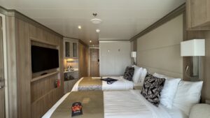 Eerst even de hut inspecteren (altijd leuk!) en kennismaken met onze roomsteward, die er straks voor zorgt dat het ons aan niets ontbreekt. De koffers zijn er meestal nog niet direct, dus een goede tip: pak de belangrijkste dingen in je handbagage.