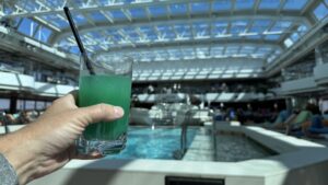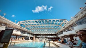 Rond 12 uur waren wij weer terug op het schip. Een lekkere lunch in de lido mag niet ontbreken. Daarna gaven wij onze benen wat rust bij het zwembad met een lekker drankje. Kijk aan het dag gaat open en kan de zon ons verwarmen. In de avond weer lekker gegeten in Dining Room. Hier een impressie van de dag op het schip.